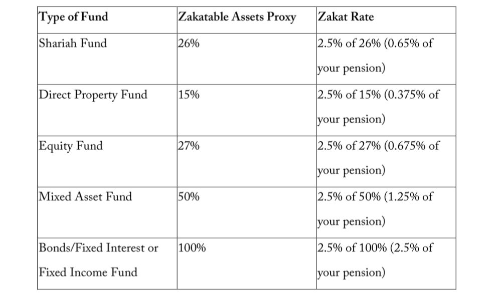 - Pension Funds: Ideally, Muslims are advised to review the fund fact sheet of the pension fund and should determine the percentage of zakatable assets. Once that is determine then one should add that value to their total zakatable assets and calculate 2.5% of the total value. If one is unable to do so, they may use the below proxys (as per Mufti Faraz Adam and the NZF).