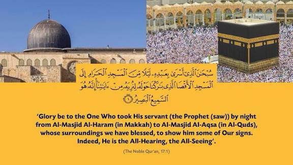 “Glory be to the One Who took His servant ‘Muḥammed’ by night from the Sacred Masjid (Masjidul Haram) to the Farthest Masjid (Masjidul Aqsa) whose surroundings We have blessed, so that We may show him some of Our signs. Indeed, He alone is the All-Hearing, All-Seeing.”